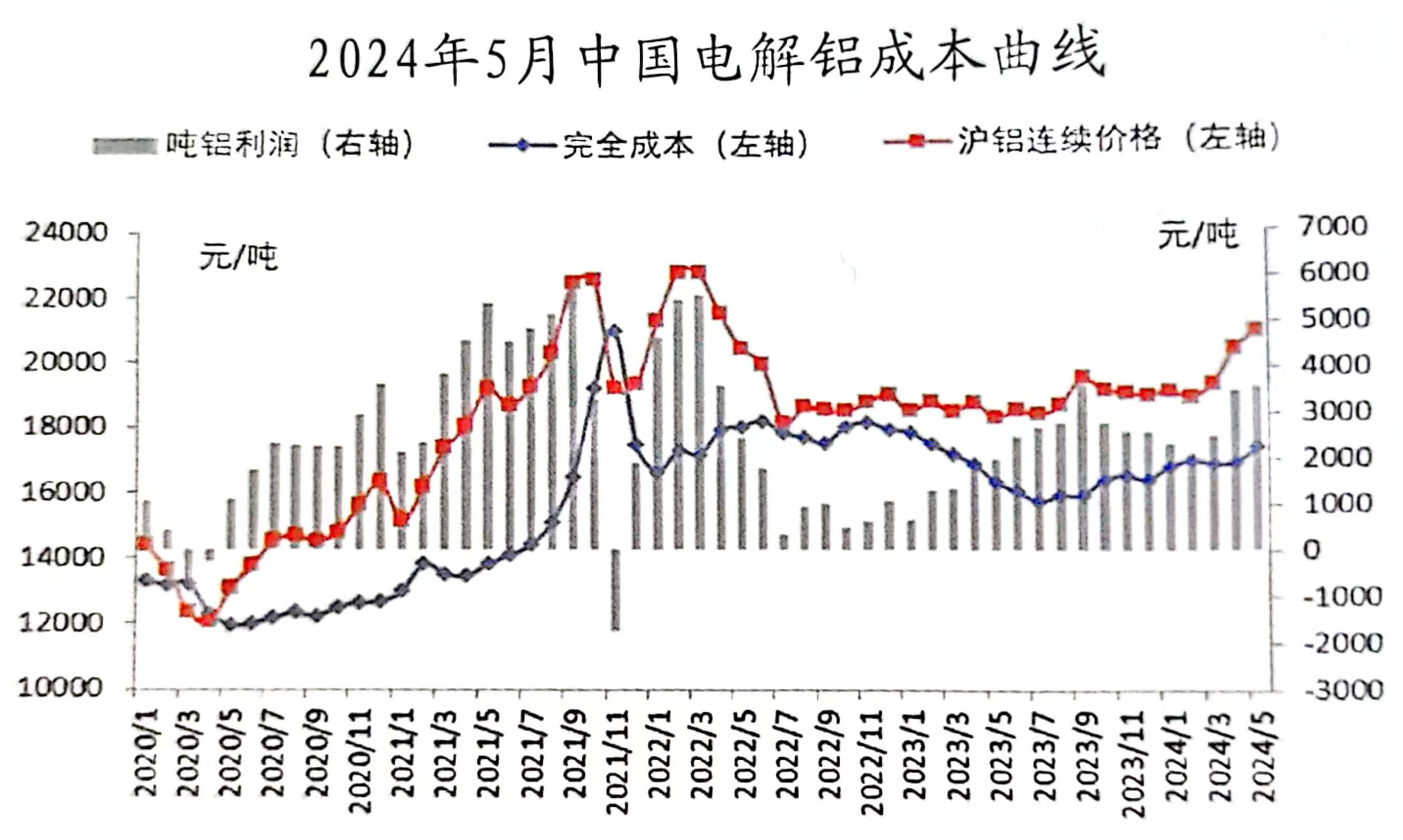 根據(jù)安泰科測(cè)算,2024年5月中國電解鋁加權(quán)平均完全成本(含稅)為17327元/噸,環(huán)比增加472元/噸或2.8%;成本增加的同時(shí)鋁價(jià)亦大幅上行,行業(yè)繼續(xù)保持高盈利水平,并連續(xù)兩個(gè)月實(shí)現(xiàn)全行業(yè)盈利。以5月份滬鋁連續(xù)合約均價(jià)20877元/噸計(jì)算,當(dāng)月平均利潤為3550元/噸,環(huán)比增加83元/噸,同比增加1571元/噸。