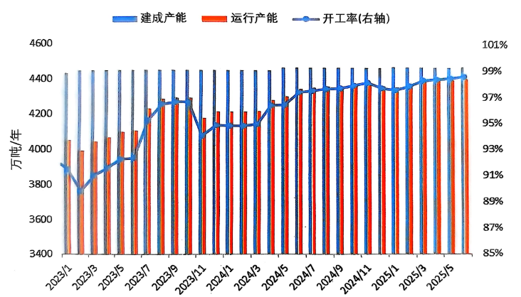 2025上半年,中國鋁行業(yè)生產(chǎn)總體較為穩(wěn)定,沒有出現(xiàn)因各種不可抗力因素導(dǎo)致的規(guī);瘻p產(chǎn),且隨著四川、貴州、青海等省/區(qū)電解鋁企業(yè)的復(fù)產(chǎn)和新建項目投產(chǎn),上半年生產(chǎn)能力得到持續(xù)提升。安泰科統(tǒng)計,截至2025年6月底,中國電解鋁建成產(chǎn)能4470萬噸/年,其中運行產(chǎn)能4405萬噸/年,較2024年底增加49萬噸。1-6月份產(chǎn)能利用率達98.1%,不斷刷新歷史新高,比去年同期高2.4個百分點:其中6月份產(chǎn)能利用率達98.5%,較2024年末高0.9個百分點。2025上半年,中國電解鋁產(chǎn)量約為2184萬噸,同比增加2.4%。
