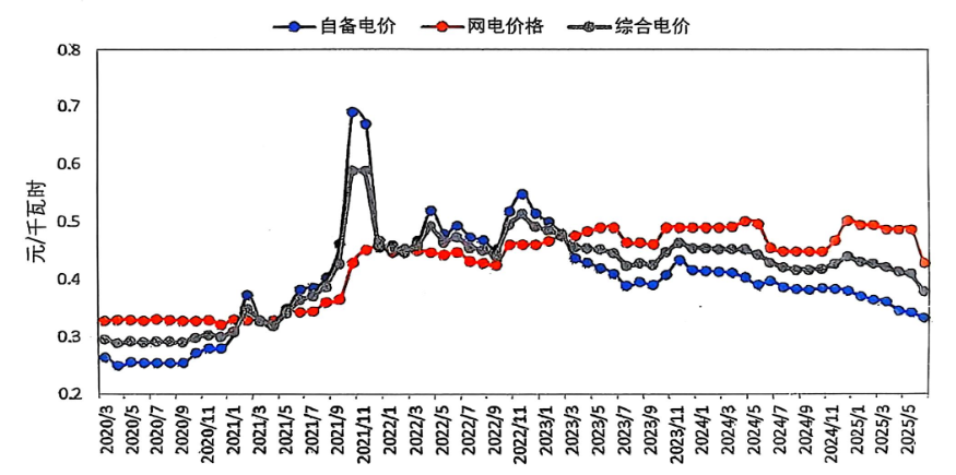 電力成本下降。截至6月底,中國電解鋁運行產(chǎn)能中的自備電比例約55%;網(wǎng)電比例約45%。煤炭價格的持續(xù)下滑導(dǎo)致鋁企自備電價降低是2025年以來電解鋁行業(yè)電力成本下降的主要原因。2025年以來,煤炭主產(chǎn)區(qū)煤礦復(fù)產(chǎn)節(jié)奏加快,進口煤到港量維持高位;而電煤因暖冬影響需求疲軟,非電行業(yè)又處于淡季,煤炭供應(yīng)寬松但需求疲軟,導(dǎo)致煤炭價格呈下行態(tài)勢,鋁廠自備電價逐步下跌。此外,廣西、云南、四川等地區(qū)網(wǎng)電價格均有不同程度的下調(diào),進一步促進了鋁企電力成本的下降。根據(jù)安泰科統(tǒng)計,2025年6月份自備電加權(quán)平均價格為0.332元/千瓦時,較2024年末下降0.048元/千瓦時,較2024年同期下降0.065元/千瓦時;網(wǎng)電價格為0.428元/千瓦時,較2024年末下降0.074元/千瓦時,較2024年同期下降0.0276元/千瓦時;綜合加權(quán)平均電價為0.379元/千瓦時,較2024年末下降0.0507元/千瓦時。1-6月份綜合加權(quán)平均電價為0.414元/千瓦時,同比下降0.034元/千瓦時。