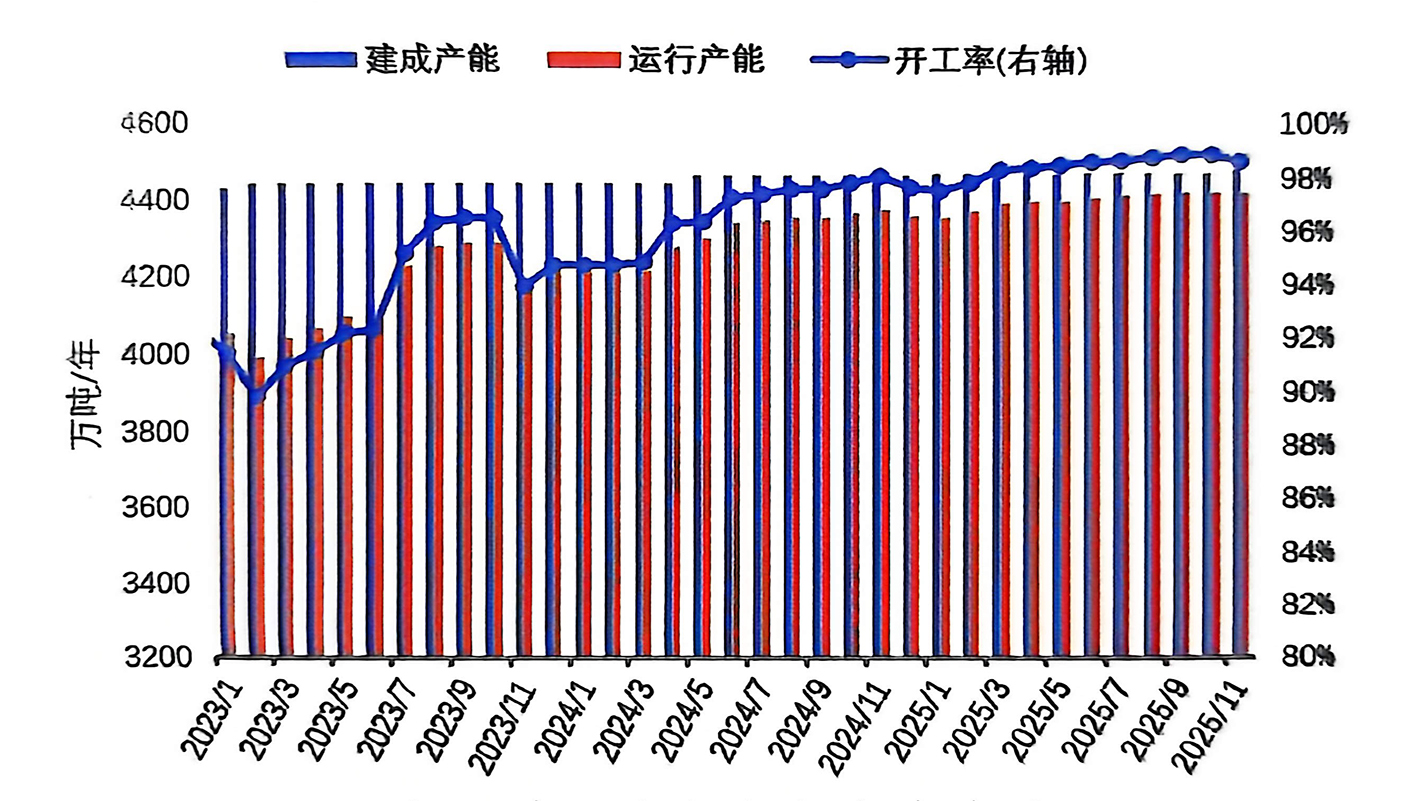 2025年11月,國內(nèi)電解鋁生產(chǎn)能力高位平穩(wěn)增長。截至11月底,建成產(chǎn)能4483萬噸/年,運行產(chǎn)能4421萬噸/年,環(huán)比增加1萬噸/年,總體生產(chǎn)力穩(wěn)定,生產(chǎn)布局仍在穩(wěn)步推進。2025年11月20日,新疆維吾爾自治區(qū)工業(yè)和信息化廳發(fā)布了新疆其亞鋁電有限公司21萬噸電解鋁建設項目產(chǎn)能置換方案的公告。該項目位于新疆準東經(jīng)濟技術(shù)開發(fā)區(qū)環(huán)城西路451號,槽型為預計500kA*156臺,產(chǎn)能指標來自新疆其亞鋁電有限公司,擬于2025年11月開工,2026年12月建成投產(chǎn)。11月26日,天山鋁業(yè)140萬噸電解鋁綠色低碳能效提升改造項目首批120臺電解槽正式開始通電啟槽,為未來140萬噸/年產(chǎn)能滿產(chǎn)運行奠定堅實基礎(chǔ)。扎鋁二期35萬噸/年計劃于12月20日通電,該項目是國家電投集團打造“源網(wǎng)荷儲直供”新范式的標志性工程,采用500kA電解槽技術(shù),2026年全面達產(chǎn),投產(chǎn)后綠電占比將達80%。預計2025年底建成產(chǎn)能將達到4525萬噸/年。目前,在產(chǎn)能接近“天花板”和開工率始終維持98%以上的背景下,后續(xù)產(chǎn)量和產(chǎn)能的增長空間非常有限。