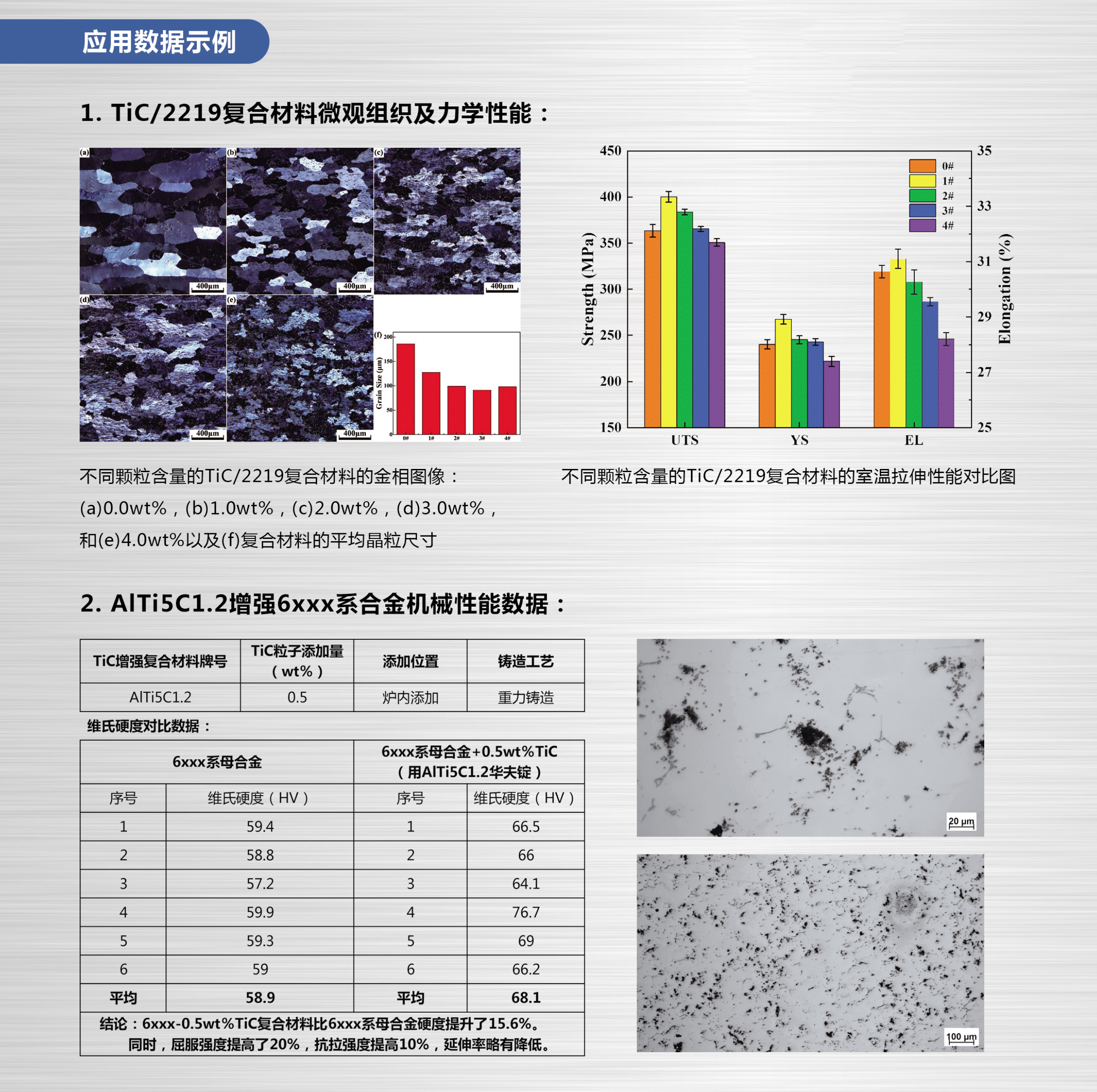 我司(秦皇島峰越科技)推出TIC增強(qiáng)型復(fù)合材料,可提高鋁材高溫力學(xué)性能20%。目前以物理混合形式最多只能在鋁材中加入0.9%質(zhì)量分?jǐn)?shù)的TIC粒子,再多會產(chǎn)生團(tuán)聚現(xiàn)象,而我司TIC復(fù)合材料可達(dá)6%質(zhì)量分?jǐn)?shù),顯著提高鋁材的抗拉強(qiáng)度和屈服強(qiáng)度。
